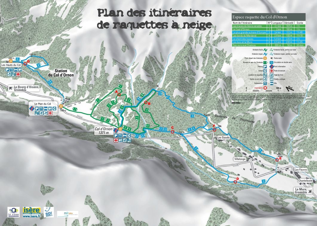 Sept circuits raquettes balisés sont proposés à partir du foyer de ski de fond "Le Chantelouve" (téléphone : +33 (0)4 76 80 44 82) et pour découvrir tout le site du Col d'Ornon.