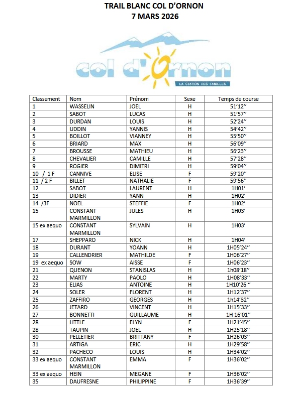 Le classement du Trail Blanc du 7 mars 2026